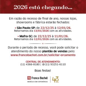 Há 43 anos, os móveis Franco Bachot equipam inúmeros estabelecimentos das mais consagradas marcas em todo o Brasil e no exterior, incluindo muitas das principais franquias e redes dos segmentos de alimentação fora do lar, shopping centers, hotelaria, condomínios corporativos, residenciais e também instituições